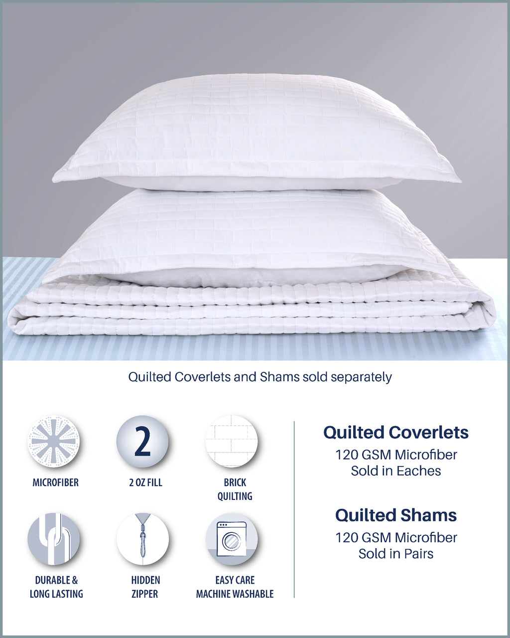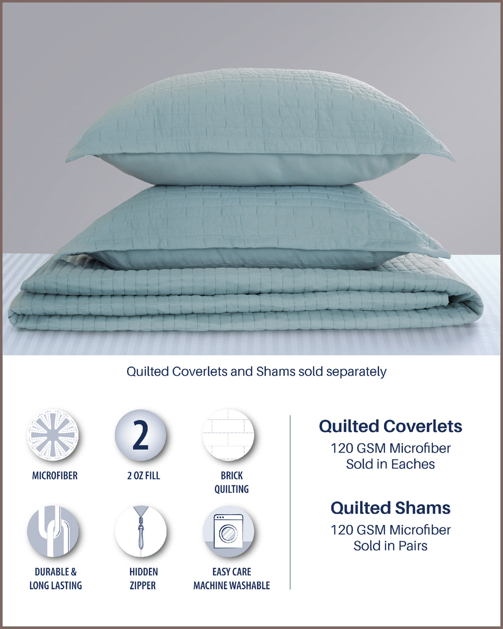 Timeless Top of Bed Style Coverlet & Shams with brick style quilting. The perfect lightweight bed covering for all seasons. Pair with our Lightweight Comforter providing layering and warmth for colder months.